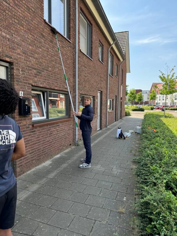 We beginnen met een zorgvuldige inspectie om te bepalen waar de meeste spinnen, insecten en hun nesten zich bevinden. Deze gebieden maken we vervolgens grondig schoon. Met een ragebol maken we ramen, overkappingen, kozijnen en gevels tot 7 meter* hoogte vrij van webben en vuil.